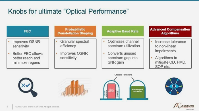 Acacia產(chǎn)品管理與戰(zhàn)略總監(jiān)Anuj Malik概述了以性能為中心的相干模塊。這些模塊的主要目標是幫助降低網(wǎng)絡(luò)運營商的資本支出(CAPEX)和運營支出(OPEX)。收發(fā)器的每比特成本和再生次數(shù)是CAPEX的關(guān)鍵驅(qū)動因素。功率、Footprint和可管理性是OPEX的關(guān)鍵驅(qū)動因素。