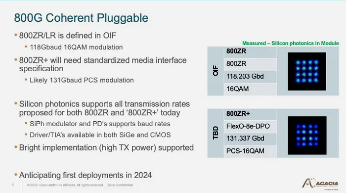 Torben接下來分享了該行業(yè)如何展望800G可插拔產(chǎn)品,預(yù)計2024年將首次部署。目前,OIF正在定義的800ZR/LR具有118Gbaud 16QAM調(diào)制。800ZR+將需要標準化的媒體接口規(guī)范,可能是131Gbaud PCS調(diào)制。Acacia的硅光子學(xué)可以支持800ZR和800ZR+的所有傳輸速率??芍С指甙l(fā)射功率版本,類似于400G Bright ZR+高發(fā)射(TX)功率可插拔模塊。