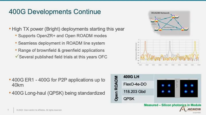 400G的發(fā)展主要集中在三個方面。首先是正在部署的高發(fā)射功率400G ZR+ QSFP-DD可插拔,支持OpenZR+和Open ROADM模式。這些模塊將400G QSFP-DD可插拔的用例擴展到城域和區(qū)域ROADM網(wǎng)絡(luò),并增加了傳輸設(shè)備中的Transponder密度。第二種是400G ER1,目標是40公里點對點應(yīng)用。第三個領(lǐng)域是400G長途的標準化和發(fā)展。