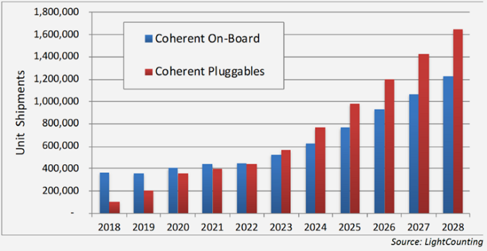 圖一:相干可插拔端口預(yù)計將在2023年超過嵌入式端口。