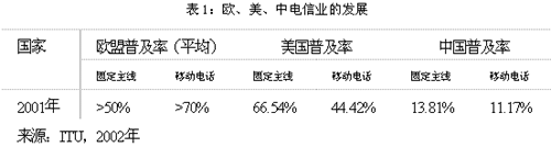 一是如表1所示,我國傳統(tǒng)語音市場的潛力仍然巨大,2001年底,我國固定主線和移動電話普及率僅有13.81%和11.17%,不到歐美等發(fā)達(dá)國家的1/4,即使到2003年底,也分別僅有20%左右。13億人口的巨大規(guī)模至少在未來幾年還能繼續(xù)支撐我國電信業(yè)的較高速發(fā)展。