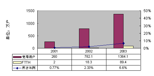 在近3年,由于日本政府的強(qiáng)力推動(dòng),日本的寬帶業(yè)務(wù)在近兩年得到強(qiáng)有力的發(fā)展。寬帶接入用戶數(shù)到2003年底已達(dá)到1358萬戶(不含無線寬帶接入用戶),寬帶用戶數(shù)增加50余倍,家庭普及率已達(dá)25%,步入寬帶普及率世界前3名的行列;而其中FTTH接入用戶到2003年底達(dá)到近90萬戶,增長率更是超過美國,列世界第一位。