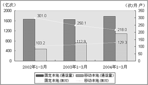 在本地通話方面,固定電話通話量與移動電話通話量的比從2002、2003年同期的2.92、2.22下降到1.69,移動電話對固定電話的競爭力度越來越大。