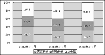 在長途通話方面,IP電話所占的比重繼續(xù)增大,對傳統(tǒng)長途電話的分流作用日益明顯。