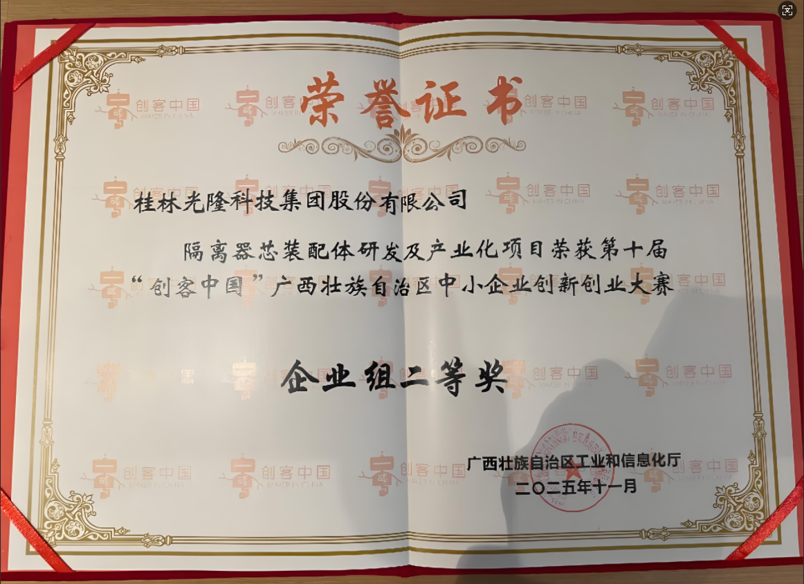在2025年全國創(chuàng)客大賽中,桂林光隆科技選派的研發(fā)中心員工卿政和劉奎代表公司出征。他們以“隔離器芯裝配體研發(fā)及產(chǎn)業(yè)化”項(xiàng)目為核心,經(jīng)過初賽、區(qū)域復(fù)賽的激烈角逐,最終以復(fù)賽第一名的成績晉級(jí)決賽,并在廣西賽區(qū)總決賽中榮獲第三名,斬獲自治區(qū)二等獎(jiǎng)!更令人振奮的是,這一成績助力公司成功入圍“全國企業(yè)500強(qiáng)”,成為廣西壯族自治區(qū)內(nèi)僅有的8家獲此殊榮的企業(yè)之一!