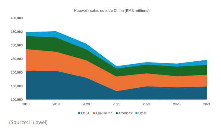 華為將大部分下降歸咎于消費(fèi)電子產(chǎn)品銷售的暴跌,制裁導(dǎo)致其無法獲得芯片和谷歌軟件對此造成了更嚴(yán)重的影響。不過該公司承認(rèn),在實(shí)施限制的國家,網(wǎng)絡(luò)銷售額也有所萎縮。這顯然包括英國,報(bào)告顯示華為在該國收入從2018年的12.4億英鎊(16.4億美元)降至去年的1.882億英鎊(2.486億美元)。盡管如此,EMEA 地區(qū)整體銷售額自2021年以來已有所上升,去年收入比2023年增長了2%。