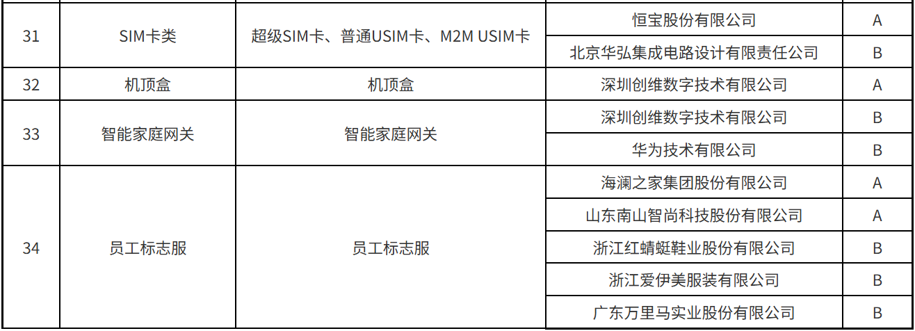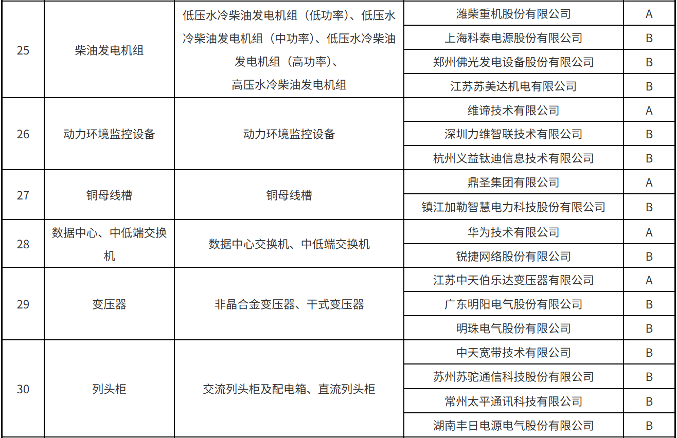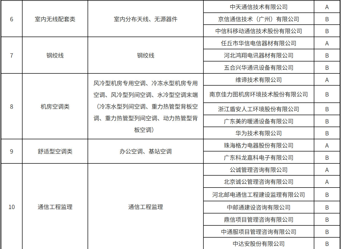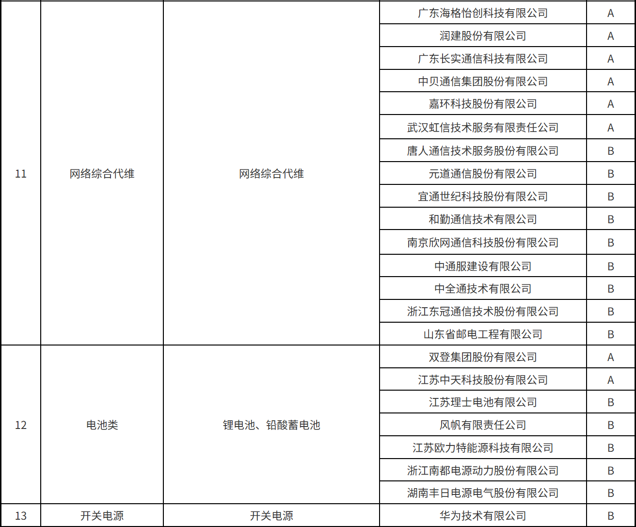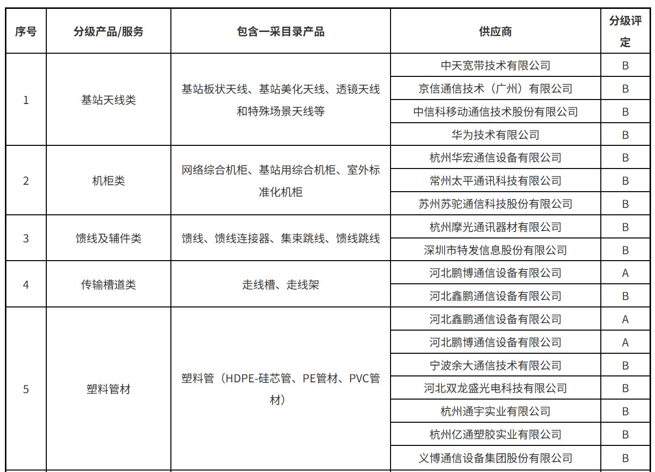 本次公示涵蓋了光纜類(lèi)、光纖分纖箱/終端盒類(lèi)、光纜交接箱/配線(xiàn)架類(lèi)、光纜接頭盒、軟跳纖類(lèi)、光分路器、數(shù)據(jù)線(xiàn)纜、基站前傳設(shè)備、數(shù)據(jù)中心/中低端交換機(jī)、智能家庭網(wǎng)關(guān)、基站天線(xiàn)類(lèi)、機(jī)柜類(lèi)等34個(gè)產(chǎn)品服務(wù)。A、B級(jí)供應(yīng)商名單具體的分級(jí)結(jié)果如下: